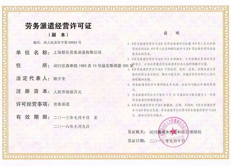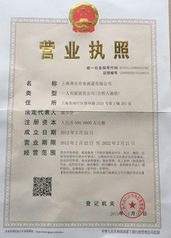 上海帮乐劳务派遣有限公司,2012年02月22日成立,经营范围包括国内劳务派遣,家政服务(不得从事职业中介、医疗、餐饮、住宿等前置性行政许可事项),以服务外包方式从事企业信息服务、企业应用管理、商业流程服务,物业管理,化工原料(除危险化学品、监控化学品、烟花爆竹、民用爆炸品、易制毒化学品)、塑料制品、金属制品(除专控)的销售等。 公司简介 上海帮乐劳务派遣有限公司是经上海市人力资源和社会保障局批准,经工商局登记注册,2008年成立的一家专业从事劳务派遣、劳务外包、临时工外包、劳务输出的劳务派遣公司。涉及电子、机械制造业、化妆品、汽车、物流、房地产、商场等众多领域。 上海帮乐劳务派遣有限公司为企业挑选合适的员工和管理层的人才,受到了客户的一致好评。上海帮乐劳务派遣有限公司拥有统一规划、管理、现代化商务办公环境和设施。随着上海帮乐业务发展的需要,同时也为了企业在劳动保障管理业务上排忧解难、消除障碍,促进用工单位的经济发展,现上海帮乐正在加快各工业园区、各院校现场办事处设立的步伐,以便及时解决用工单位及派遣员工的各项事宜。 服务宗旨 帮乐的宗旨:诚信、专业、高效、创新、人性化 帮乐的项目:劳务派遣、临时工外包、自主管理、社保、公积金代缴 帮乐的优势:提供社会化后勤服务,包括员工宿舍筹建管理、班车接送、负责工伤过程中的理赔、申报、慰问过程、一些节日会发放礼品等。 帮乐将用开放的视野和包容的胸怀迎接未来,探索无限的可能性并发挥个体的创造性,以创新、勤奋、踏实、热忱、执着不懈的奋斗精神,将更好地服务奉献给社会和每一位客户。 企业资质 ![]() ![]() |